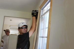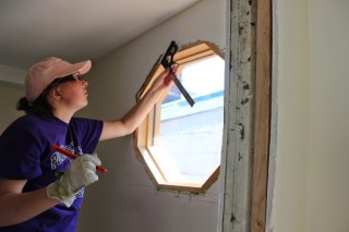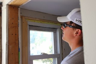 Olivia marks a window in the bedroom in preparation for casing the window out.