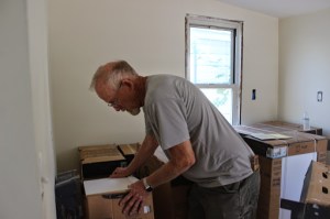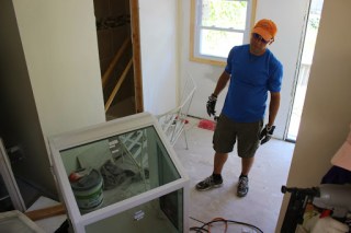 Jeff inspects the opening in the front bath room where the homeowner wants to install a casement window.