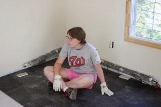 Don and Olivia prepare the living room floor for flooring to be installed.