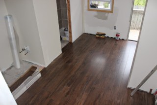 Day two was a long one. We got started a bit after 9:00 AM but did not stop until sometime after 8:00 PM. Good progress was made. We finished casing out the windows, leveled out the living room sub-floor, installed most of the flooring in the living room, finished the doorway between the kitchen and bedroom, finished hanging the kitchen cabinets, finished the new wall area that we created when we installed the garden window in the kitchen and prepped the garden window to be cased. Plus, Bruce, our skilled carpenter, took a couple of hours to help do some tile work at another house on the island.