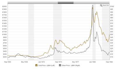 Silver and gold prices from September 1966 through September 1982 (in 2012 dollars).